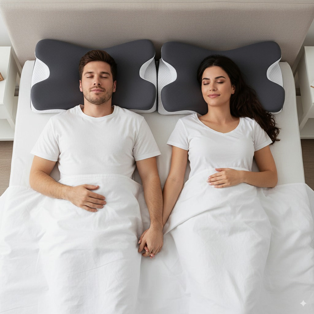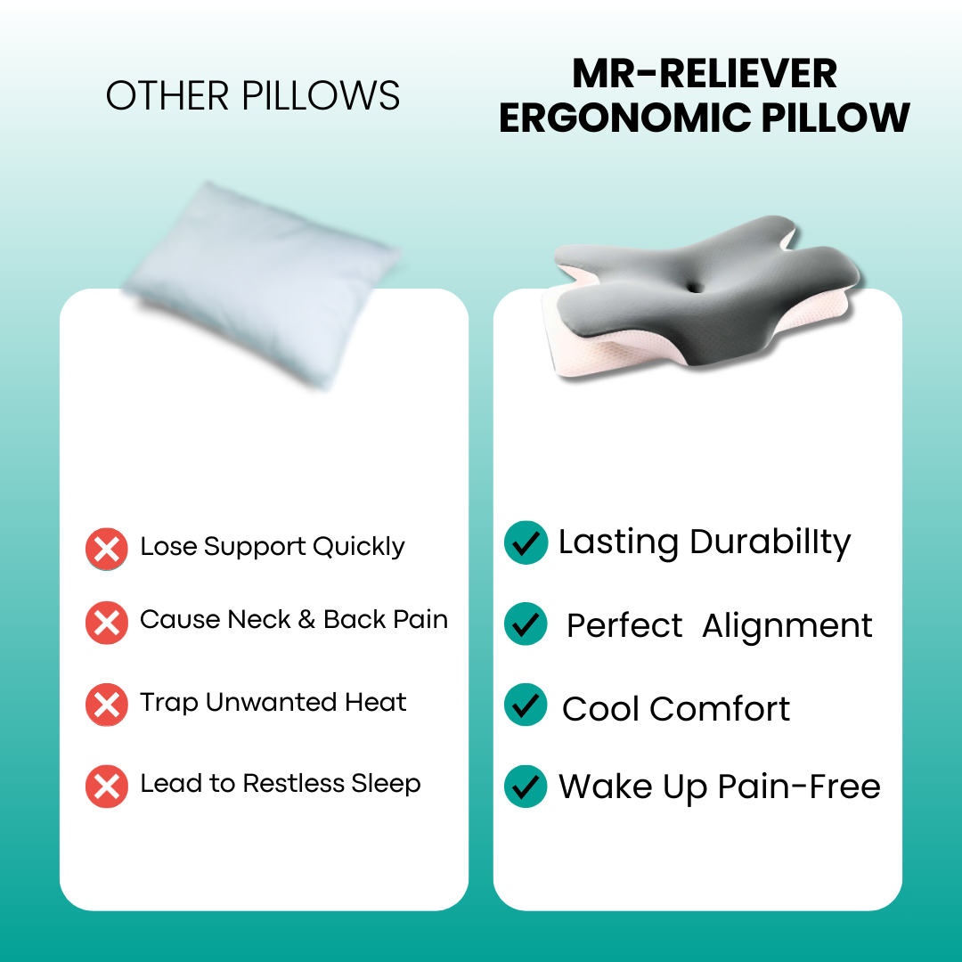 Traditional pillows fail because they lose support and create spinal misalignment. The Mr Reliever pillow maintains its ergonomic contour all night, cradling your neck's natural curve.